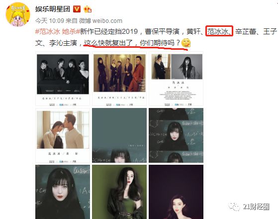 今天,大V@娱乐明星团在微博上表示:#范冰冰 她杀#新作已经定挡2019,曹保平导演,黄轩、范冰冰、辛芷蕾、王子文、李沁主演,这么快就复出了,你们期待吗?