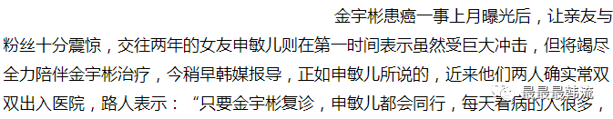 前段时间金宇彬患癌症暂停了活动,吃瓜群众在关心鱼饼身体状态的时候也在关心申敏儿。