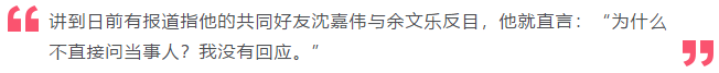 而张智霖昨晚出席活动时被问到余文乐与沈嘉伟反目一事,他说:「我不知道,为何不问他们本人?这个我不予置评。(兄弟情不再?)各有各忙吧。」