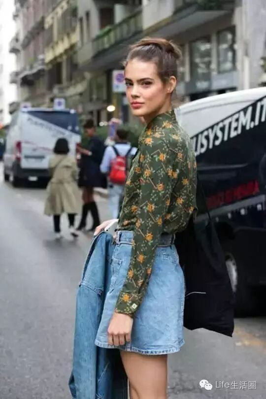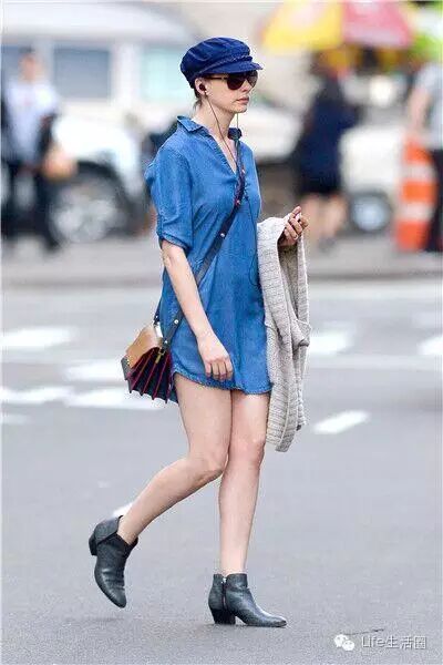 单宁元素也是多年来最in的时髦元素,像安妮这样搭配同材质的鸭舌帽,搭配复古风小挎包,干净利落。
