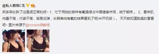 按理说郑多燕还是知名的健身人士,不应该发福的,可是她怎么就胖了呢?关于这点,健身名人@私人教练C戈这么说的: