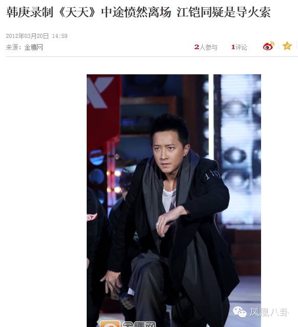 韩庚还因为引起了罢录风波,传闻录制《天天向上》时,因为节目组涉及到早前传出绯闻的江铠同,韩庚悄然离场。