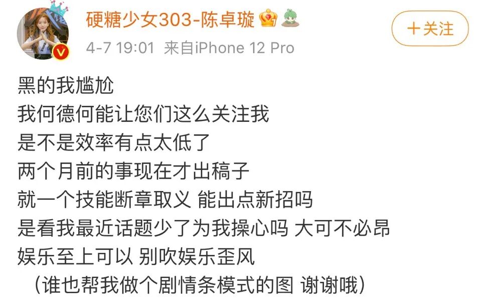 4月7日,陈卓璇发文回应评价张雨绮的相关言论,她表示有人在刻意黑她,才会把很早以前的事情故意拿出来断章取义,还说大家大可不必。