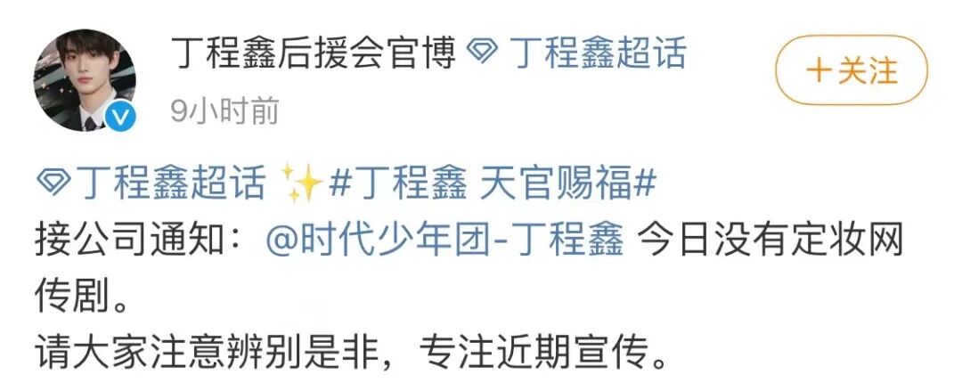8日,网传时代少年团的丁程鑫到横店《天官赐福》剧组定妆“谢怜”一角,引发热议。随后丁程鑫后援会官博发文,称接经纪公司通知,丁程鑫今日没有定妆网传剧,且没有网传剧的拍摄计划,正式辟谣传闻。