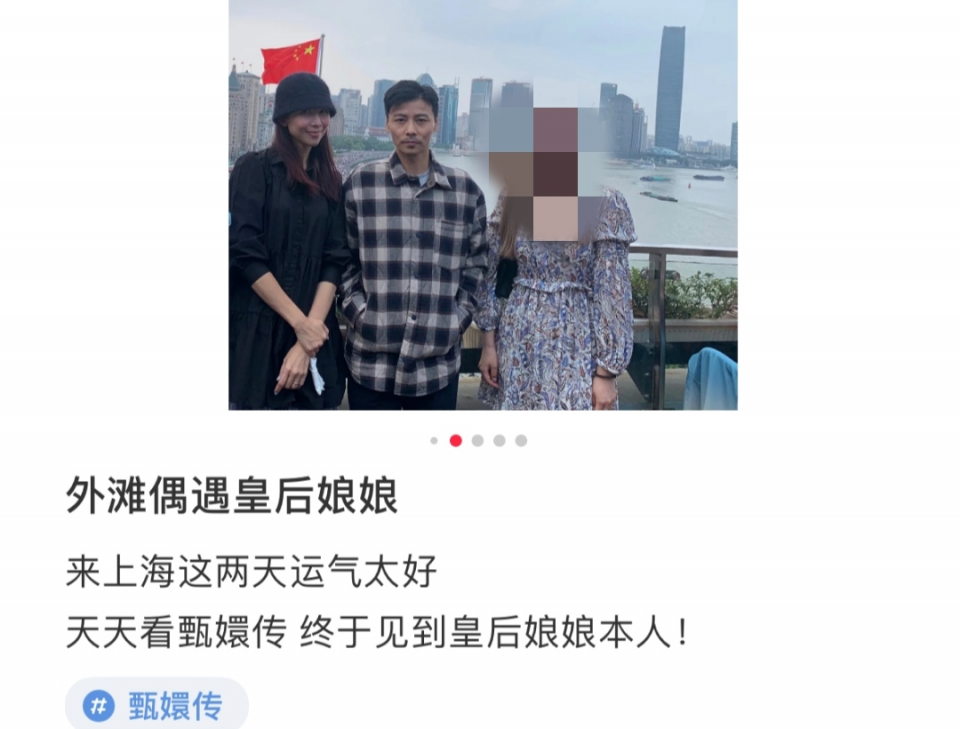 近日,有网友在自己的社交平台上发文称自己在上海外滩偶遇了蔡少芬一家人,真是运气极好,并晒出了自己与蔡少芬和张晋的合照,以及几张自己拍的现场照片。