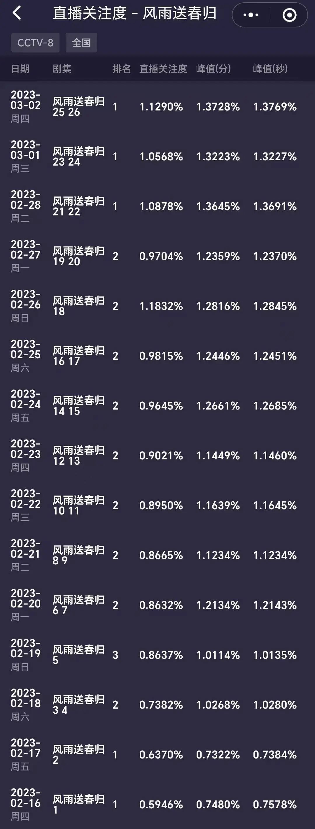 在最新一周的CVB收视榜单中,《风雨送春归》更是跻身第三。