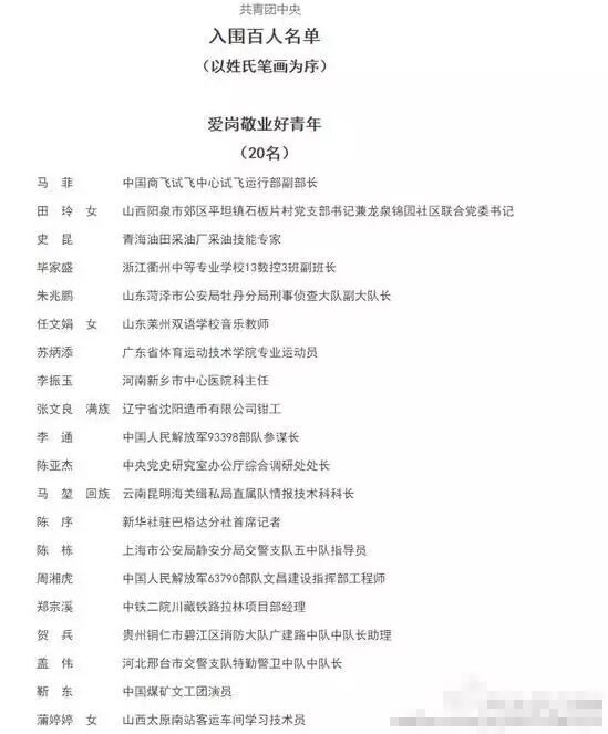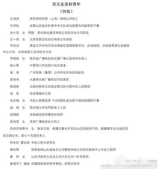 4月20日,中国共青团官网发布“全国向上向善好青年”名单,并称:“推选活动由共青团中央宣传部主办。根据2016年推选活动安排,经过公众投票、评委会专家投票,最终评选出爱岗敬业、创新创业、诚实守信、崇义友善、孝老爱亲等5类共计100名“全国向上向善好青年”。现将入围百人名单进行公示。如对公示的入围者持有异议,请于2016年4月22日前向团中央宣传部实名反馈。”