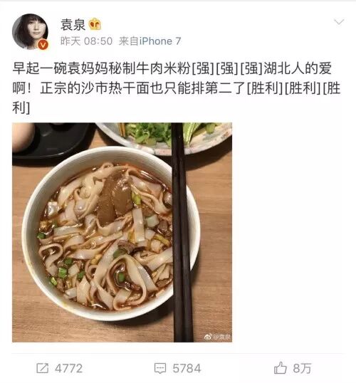 15日,荆州籍影视明星@袁泉 晒出一条微博:早起一碗袁妈妈秘制牛肉米粉,湖北人的爱啊!正宗的沙市热干面也只能排第二了。