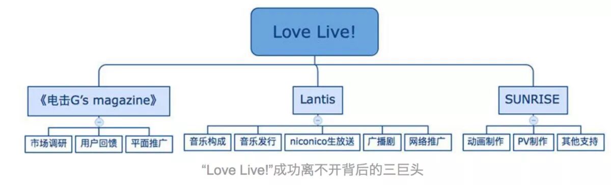 这种模式的原型是日本的《Love live!》模式。《Love Live!》是由唱片公司、动画公司以及动漫杂志共同在2010年推出的读者参与型偶像企划。从音游起家的《Love Live!》经过动画、歌曲、真人多渠道联动成为了国民级的大IP,也让内容中的偶像团体成功突破次元壁;整个IP在2016年的市场消费值大约在423亿日元(约22.4亿元)。