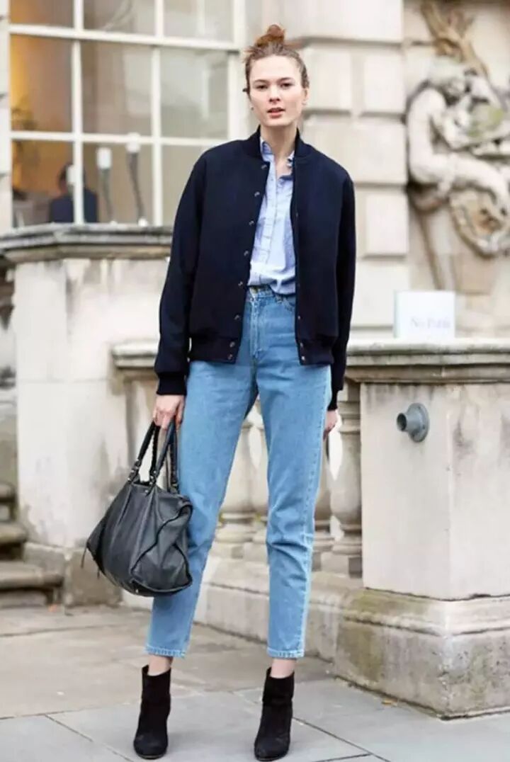 短款外套和时髦和复古相结合的直筒牛仔裤组合,把衣服塞到裤子里。