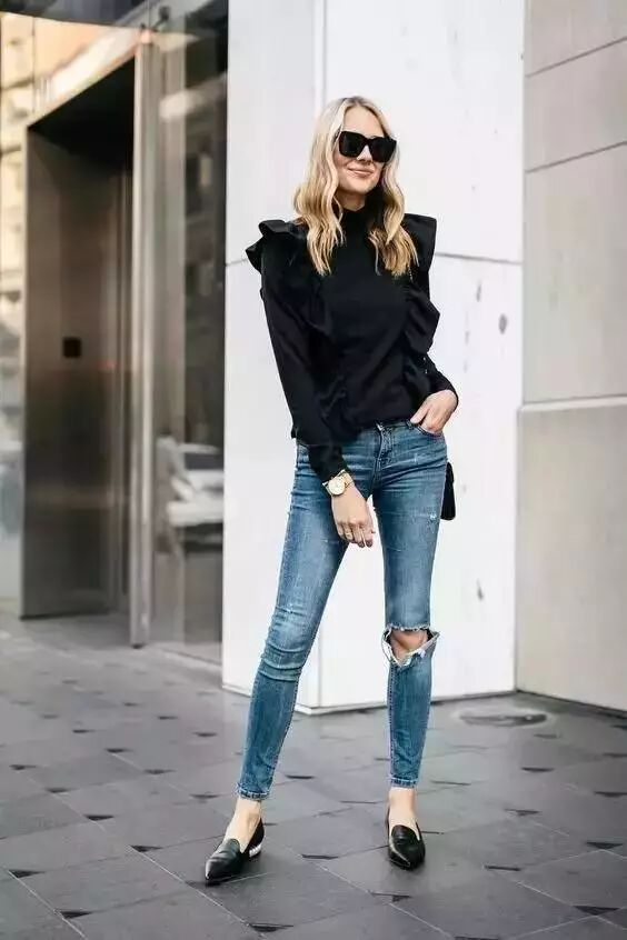 选择九分的紧身牛仔裤视觉上就有很显著的显瘦作用,任何类型的牛仔裤也不妨碍搭配简直就是万能。