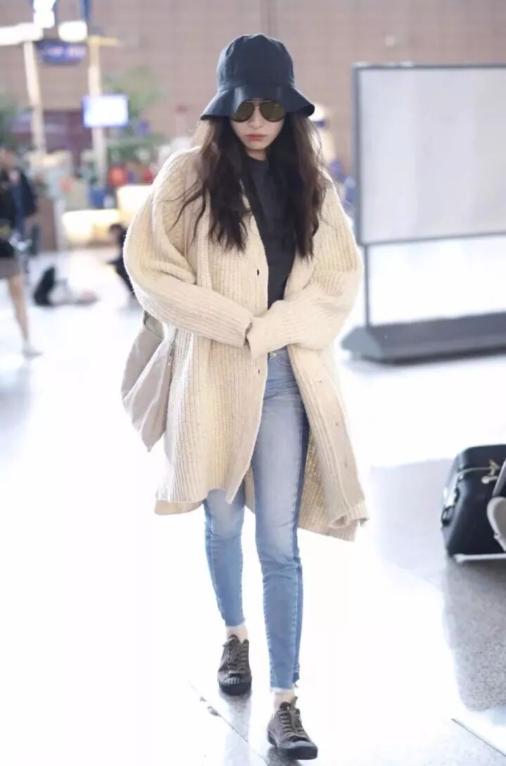 倪妮用毛衣外套搭配牛仔裤加上渔夫帽,可爱的渔夫帽很是抢眼,毕竟搭配好,穿什么都好看。
