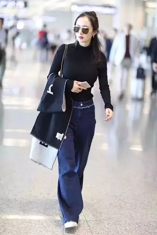 而大幂幂也多次穿过这种阔腿裤,上身搭配紧身针织衫更显高挑身材,和熟女魅力。