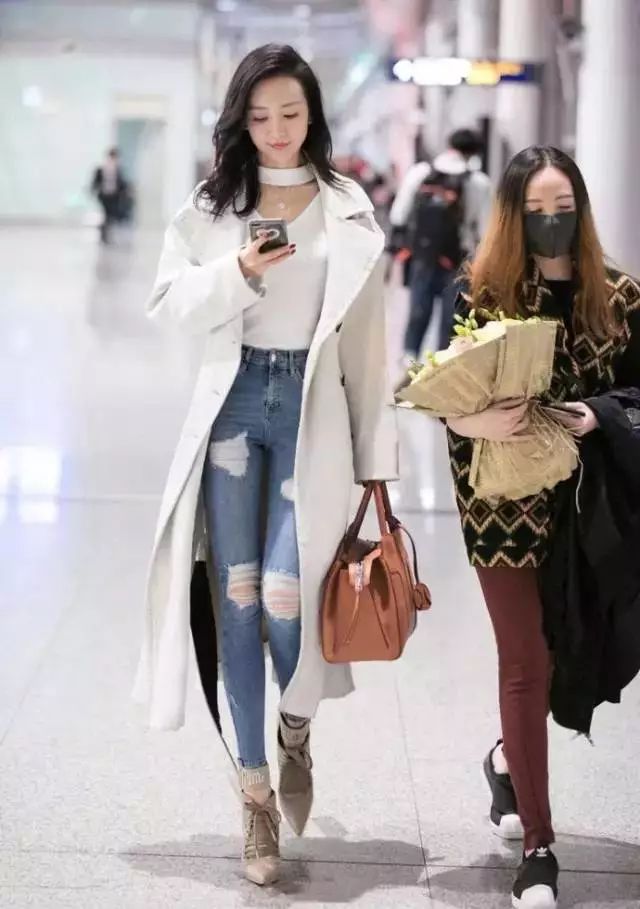 高圆圆就是用直筒牛仔裤,加上长款大衣,走路带风。