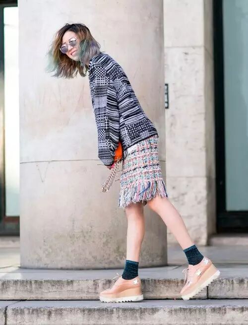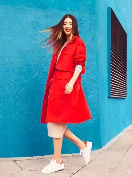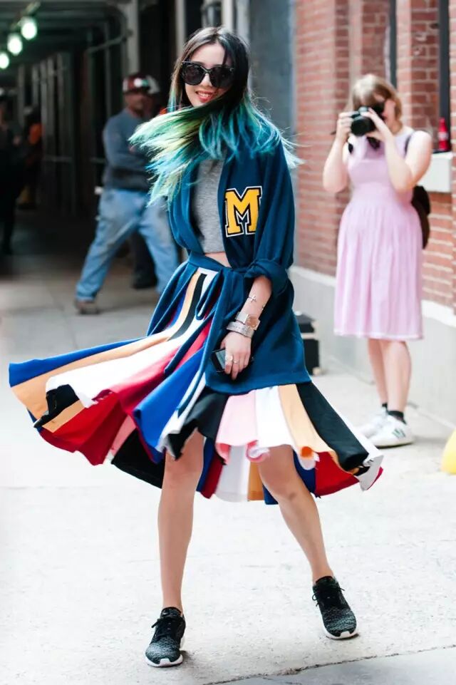 这身是Madam最喜欢的一套了,孔雀蓝浴袍中款外套搭彩色伞裙,既时髦又复古,脚上又随性搭一双运动鞋,这样的姑娘惊艳得像一盒彩虹豆。