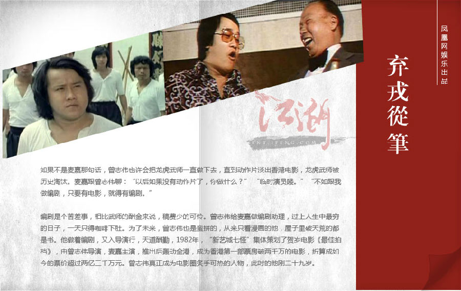 如果不是麦嘉那句话,曾志伟也许会把龙虎武师一直做下去,直到动作片淡出香港电影,龙虎武师被历史淘汰。麦嘉跟曾志伟聊,问他:“以后如果没有动作片了,你做什么?”“临时演员喽。”“不如跟我做编剧,只要有电影,就得有编剧。”