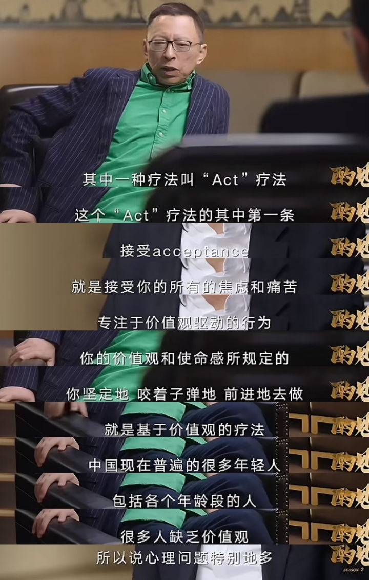 “你的价值观和使命感所规定的,你坚定地、咬着子弹地、前进地去做。中国现在普遍各个年龄段的人,尤其是年轻人,缺乏价值观,所以心理问题特别多。”