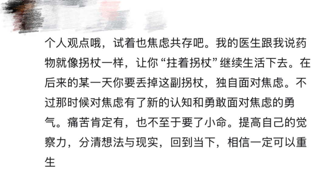 “我的医生跟我说药物就像拐杖一样,在后来的某一天你要丢掉它,独自面对焦虑。提高自己的觉察力,回到当下。”
