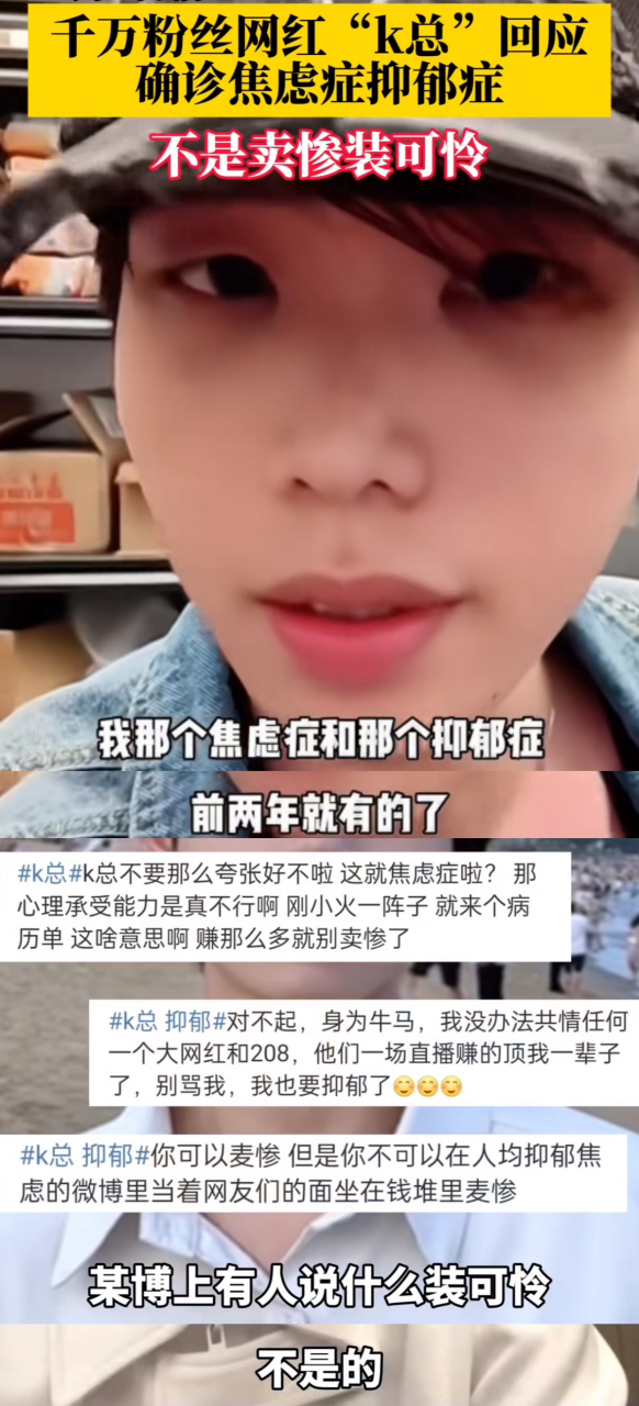 比如千万粉丝网红“k总”,就同时确诊了这两种病:焦虑症和抑郁症。