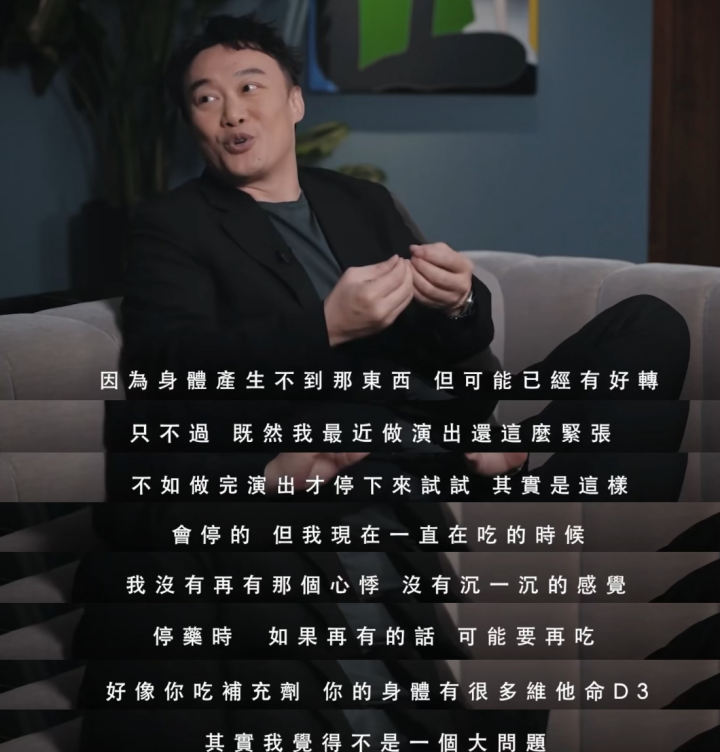 相比令他无意识跌倒、下巴摔到“露出白骨”、被缝了30针等后果,上述的躯体化表现不过是焦虑症在陈奕迅身上反映出的一些小小症状罢了。