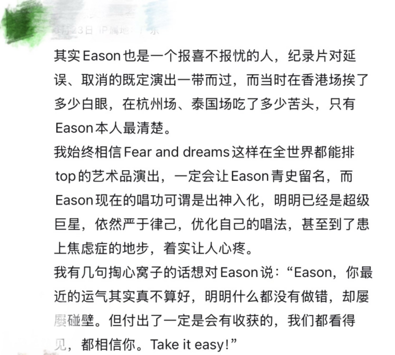 歌迷们仿佛有种感觉:难道下一秒,Eason要准备淡出了?