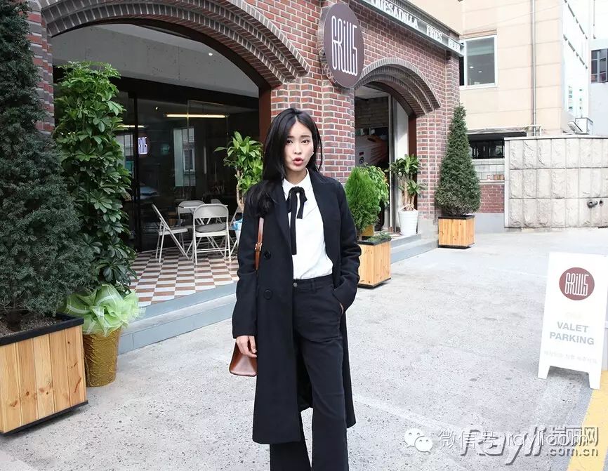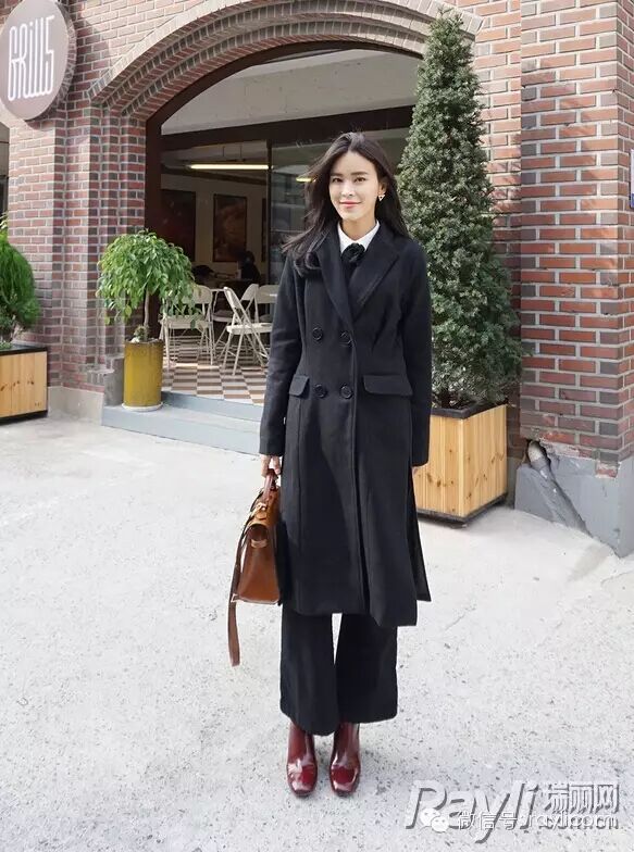 双排扣大衣是学院风的冬季最爱,内搭系带白衬衫添文艺质感。