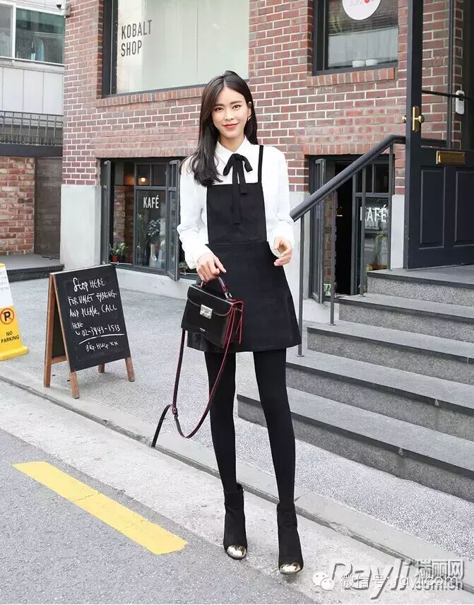 用蝴蝶结装饰白衬衫搭配背带下装,立马减龄,变清纯学院妹。