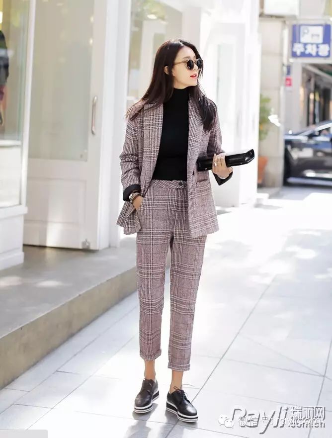 格纹西装搭配尖头牛津鞋,脚踝微露的时髦穿法还可以再撑几天。
