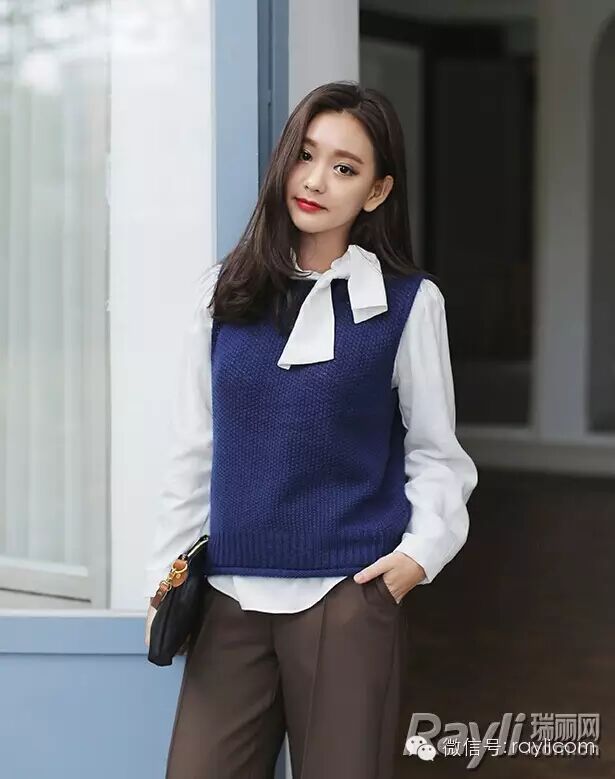 藏蓝色针织背心搭配蝴蝶结装饰衬衫,干净又文艺。
