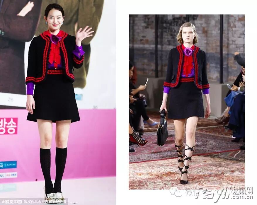 申敏儿的这身造型来自古驰 (Gucci) 2016早春度假系列。Alessandro Michele这季依然玩的是60年代复古风,大胆的配色,繁复的蕾丝花朵装饰,复古文艺,花哨闷骚。