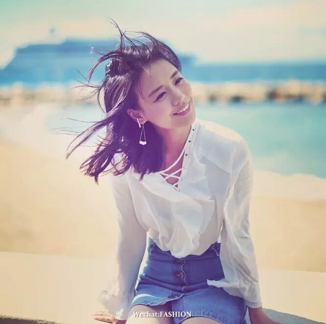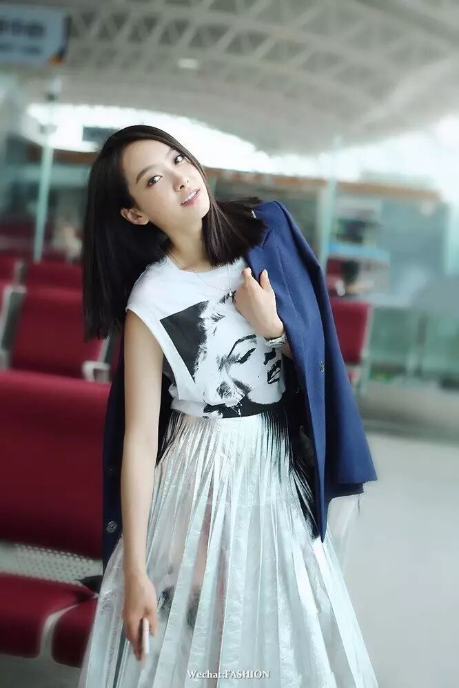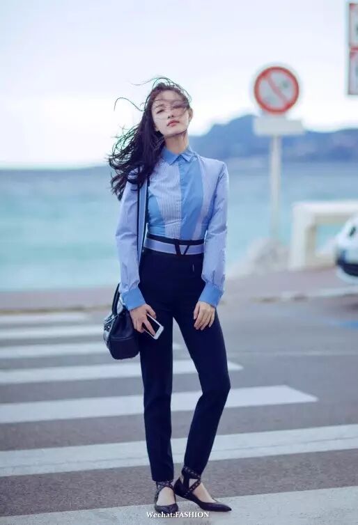 江疏影穿蓝色条纹衬衫与吊带小背心叠穿,时髦感十足。