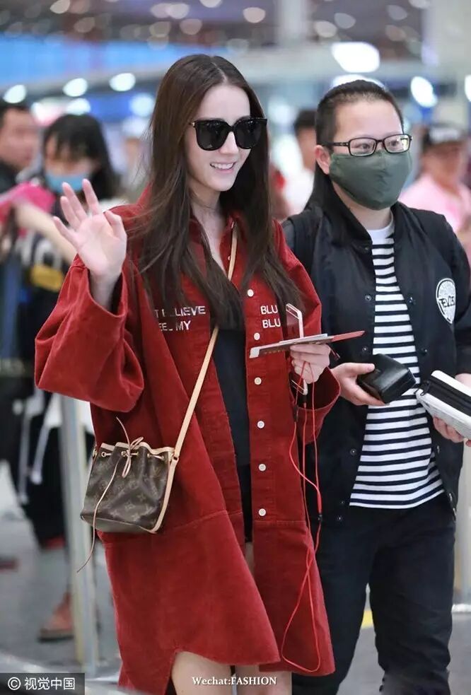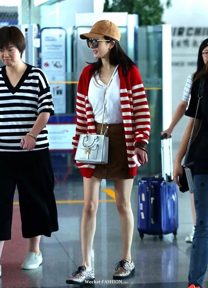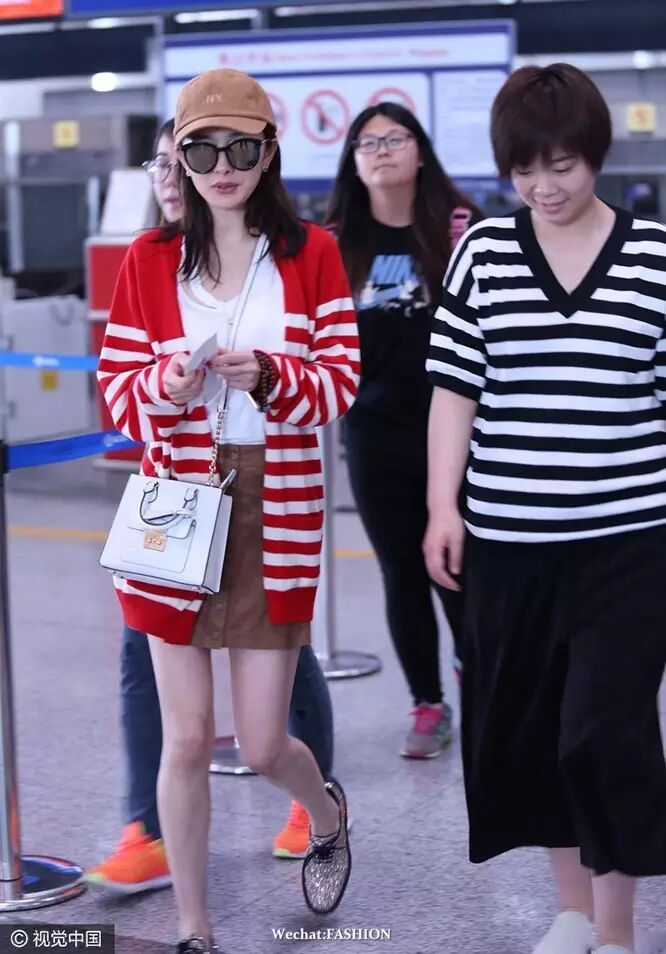 杨幂现身机场,Saint Laurent红白针织衫搭配MK迷你裙,斜背Michael Kors Bridgette挎包,大走少女风。