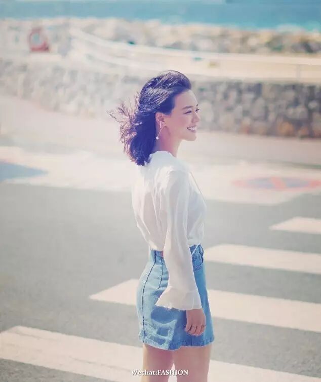 白色薄款绑带衬衫搭配牛仔短裙,打造小清新少女形象。