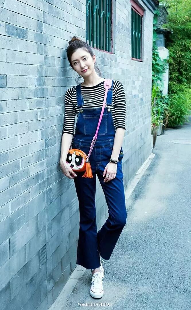 江疏影穿摩安珂 (MO&Co.) 阔腿牛仔背带裤内搭黑白条纹衫,一双匡威 (Converse) 低帮帆布鞋蛮简洁。莫斯奇诺 (Moschino) 飞天小女警的包可爱又惹眼。