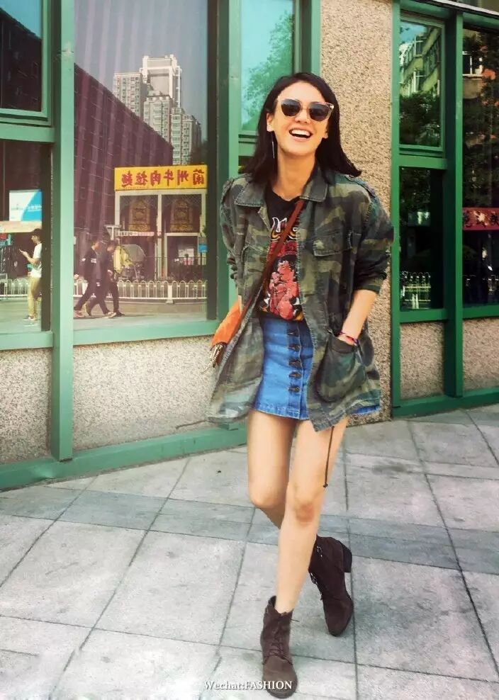 黑色潮T搭配纽扣牛仔裤,外搭迷彩外套,帅气又时髦。