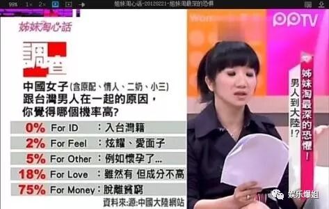 在台湾知名主持陶晶莹的一档节目《姐妹淘心话》中,陶晶莹与嘉宾谈起对内地的种种印象。节目中男嘉宾炮轰内地人“穷”,称内地女生:连包包都没见过。而陶晶莹也讲自己在内地四星级酒店按摩却遇到色情服务的经历,表情夸张不已。