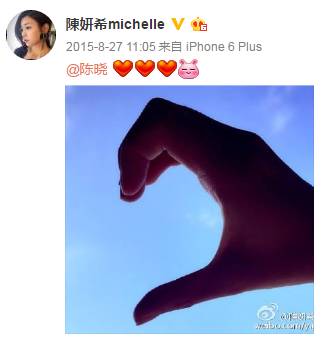 别看拍出来的半颗爱心这么唯美,陈晓拍这张照时的画风是这样滴,仰望天空,一手比着爱心,一手拿手机自拍,姿势太销魂……