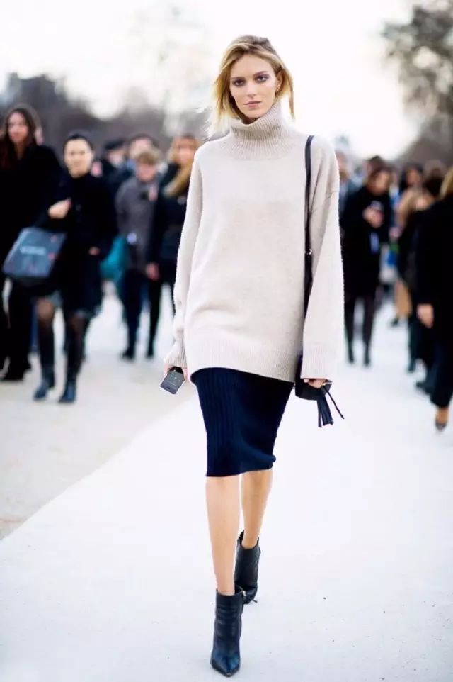 oversize的毛衣与紧身的铅笔裙搭配在一起能营造出一种慵懒的性感美,在保暖的同时仍旧能够勾勒出动人曲线。