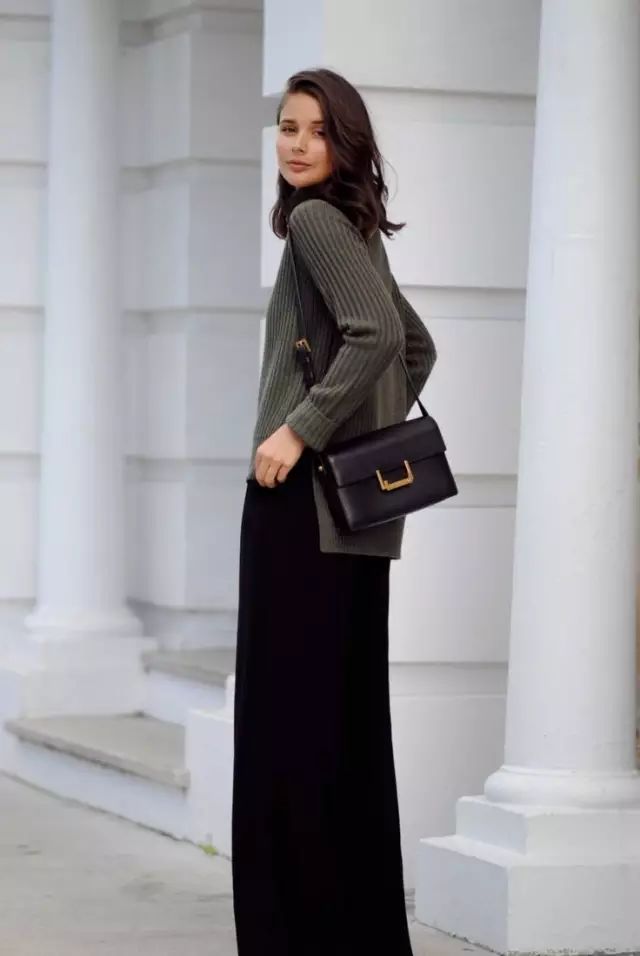 需要注意的是,搭配阔腿裤时最好选择短款或稍微修身一点的毛衣,才会不至于过于臃肿和松散。