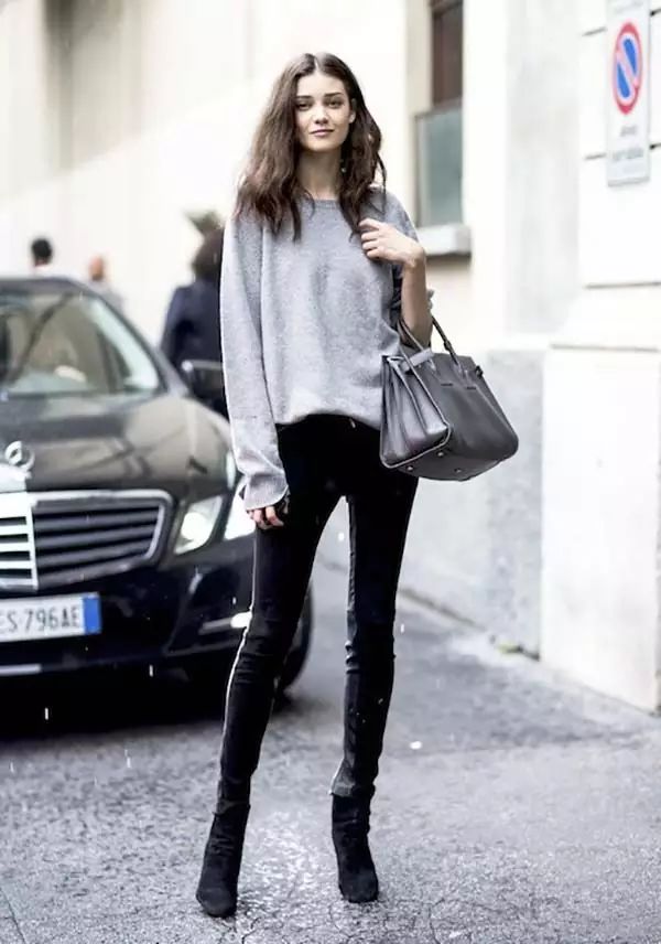 经典黑白灰搭配小脚裤也能很出彩,而且足够chic。再配上黑色及踝短靴就能在视觉上很好地拉伸腿长,显高又显瘦。