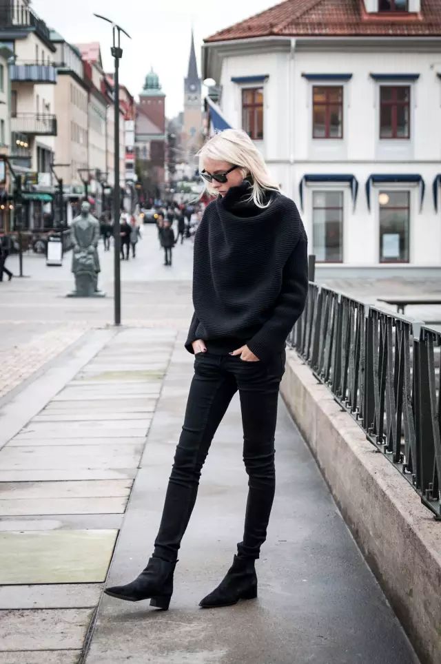 最保险和搭配就是毛衣配黑色小脚裤啦,显瘦保暖两不误。尤其是厚实宽大的毛衣,上身之后,容易稍显臃肿,但是配上黑色修身小脚裤的,完美符合“上松下紧”的黄金穿衣法则,就能显瘦啦。