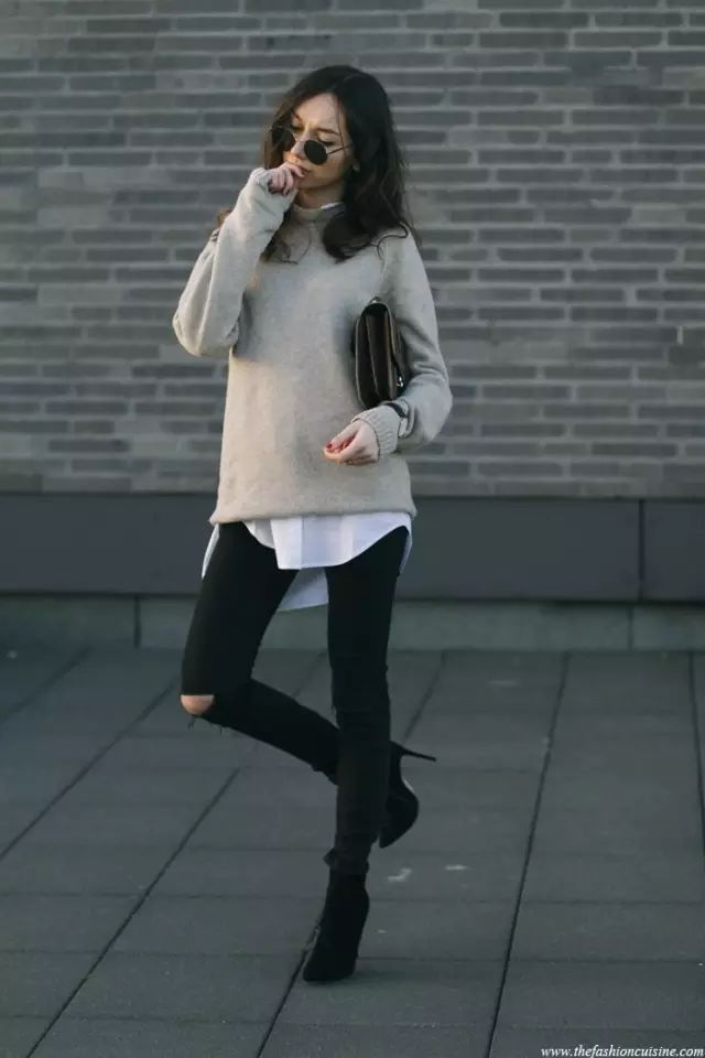 毛衣内叠穿衬衫变得越来越常见了,但它仍旧是时髦的穿法,并没有过时哦。既能增加保暖指数,又能展现丰富的层次感。经典白衬衫更是毛衣的最佳内搭选择!