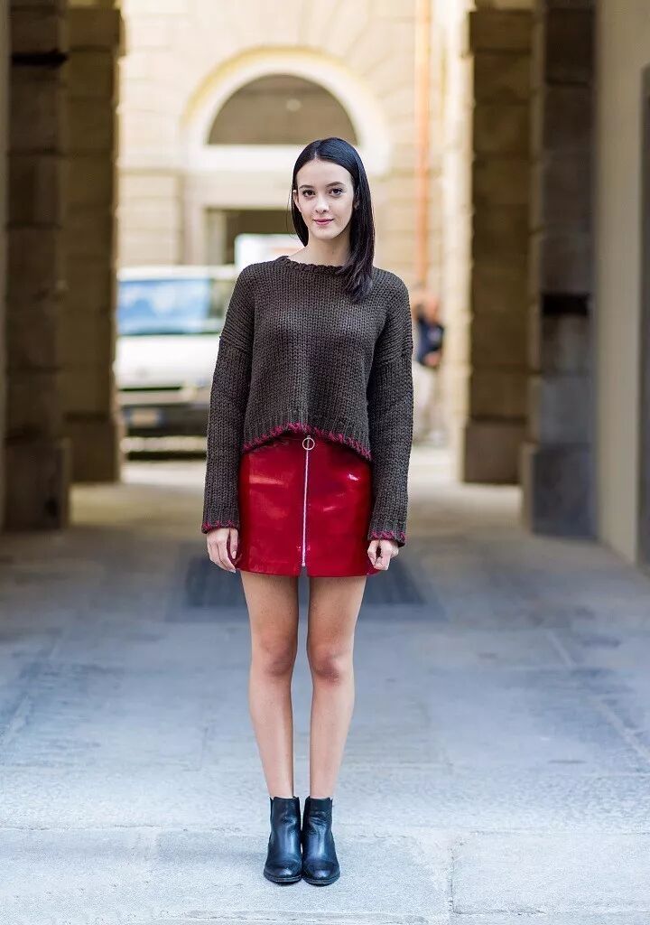 毛衣的柔软配上皮裙的硬朗,可以说是完美的中和了。需要注意的是,在选择皮裙的时候,尽量避免太过贴身的款式,稍微宽松点的皮裙更有气质。