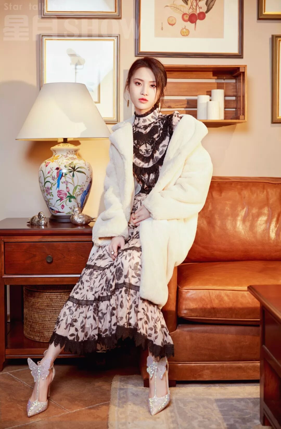 这是一套很复古的搭配,白色碎花长裙搭配黑色蕾丝边,淑女中透着一丝小性感,白色毛呢外套不仅起到保暖作用,更有一种民国名媛的感觉。脚上那双高跟鞋很有意思,蝴蝶造型增添了一种童心与甜美。
