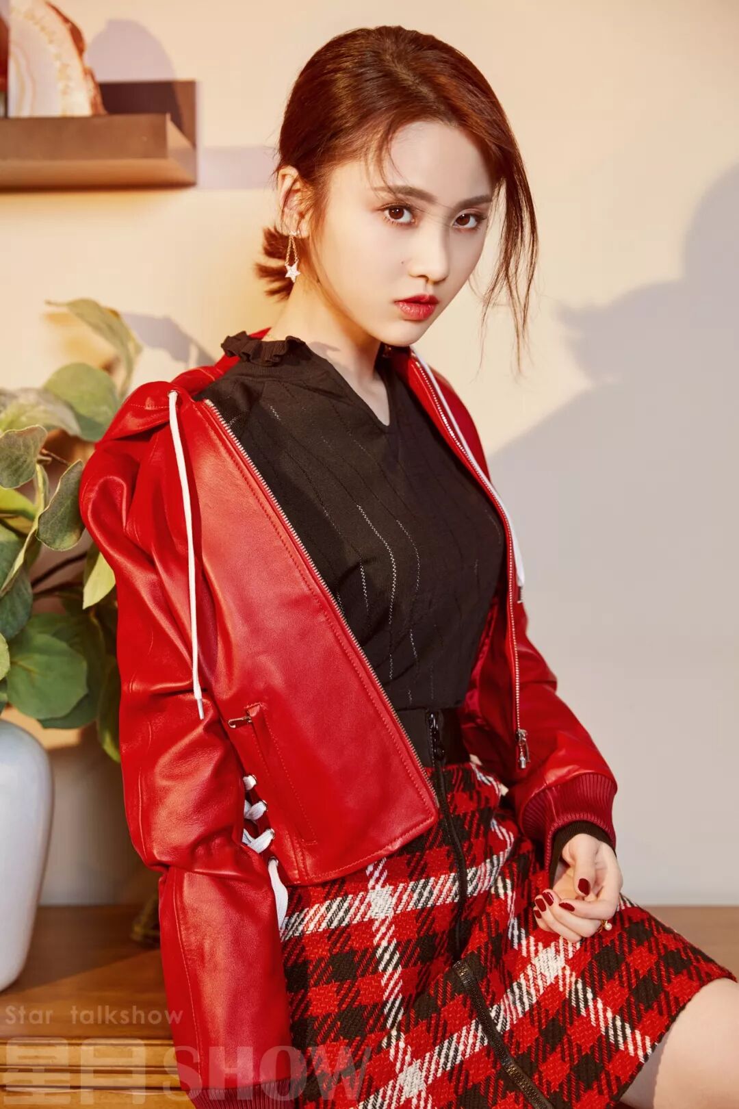这一套搭的真的很惊艳,一方面是小精灵的感觉,另一方面又有一点朋克,展现了慧雯的野性美,红色还特别有过年的气氛,下面搭配黑色高筒靴或者带一点条纹,都是不错的选择。