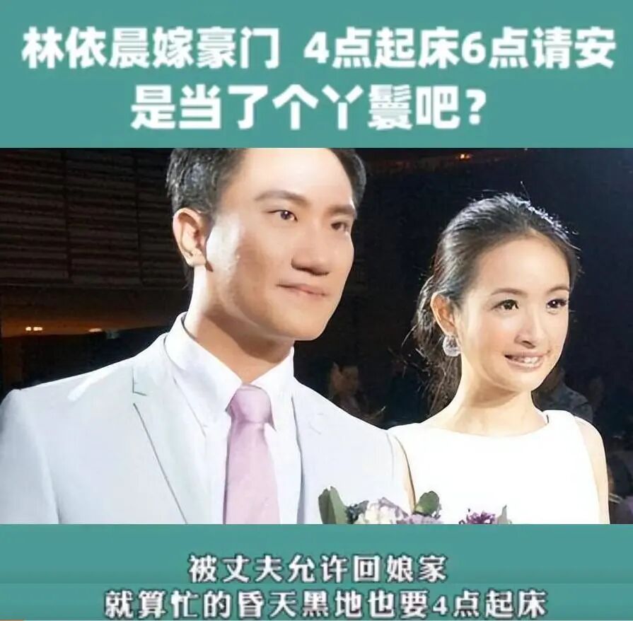 林依晨曾在节目中透露,自己每天早上4点就起床做早餐,6点准备要给公婆请安,即便忙得昏天暗地也不能打破这个规矩,让网友吐槽:这哪是嫁入豪门,这是当了个丫环吧。