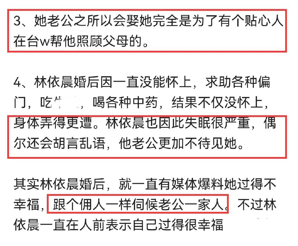 还有知情人士的称,林依晨老公的兄弟说,娶林依晨只是想让她帮忙照顾父母罢了。