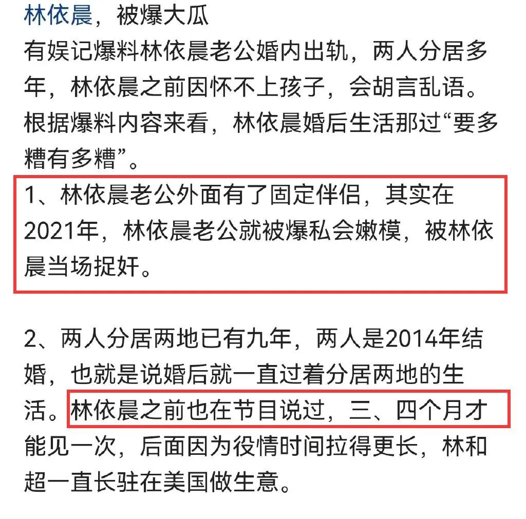 娱记表示两人多年异地,一个忙着在国外做生意,一个则在湾湾带孩子照顾公婆,相处的机会十分少。早在2021年,林于超便被曝私会嫩模,被林依晨当场抓包。这些年,林于超更是早有了固定的伴侣。之所以还和林依晨维系婚姻,完全是为了让林依晨照顾自己的父母。