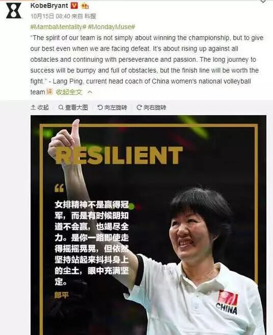 (NBA传奇巨星科比·布莱恩特转发女排精神)