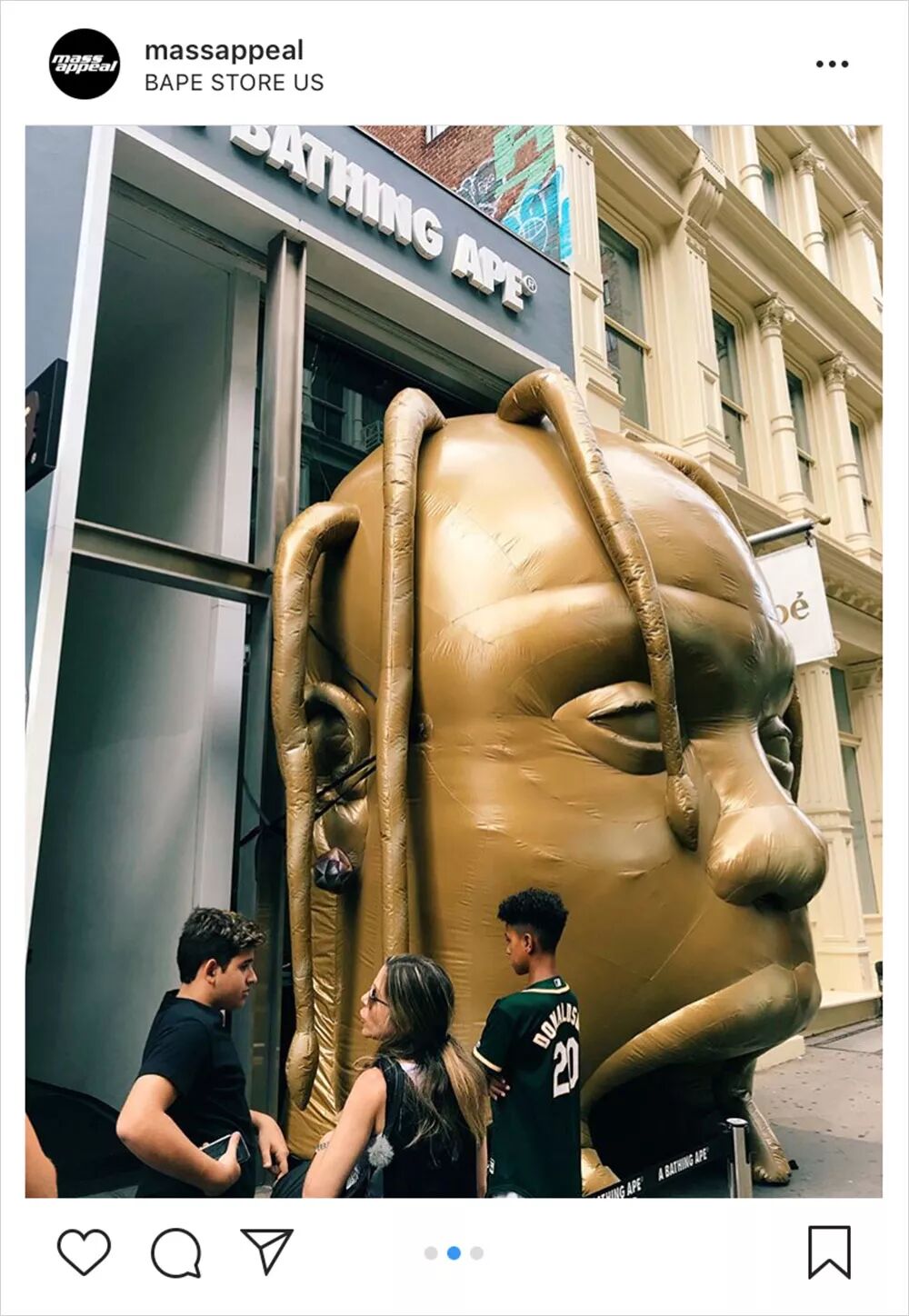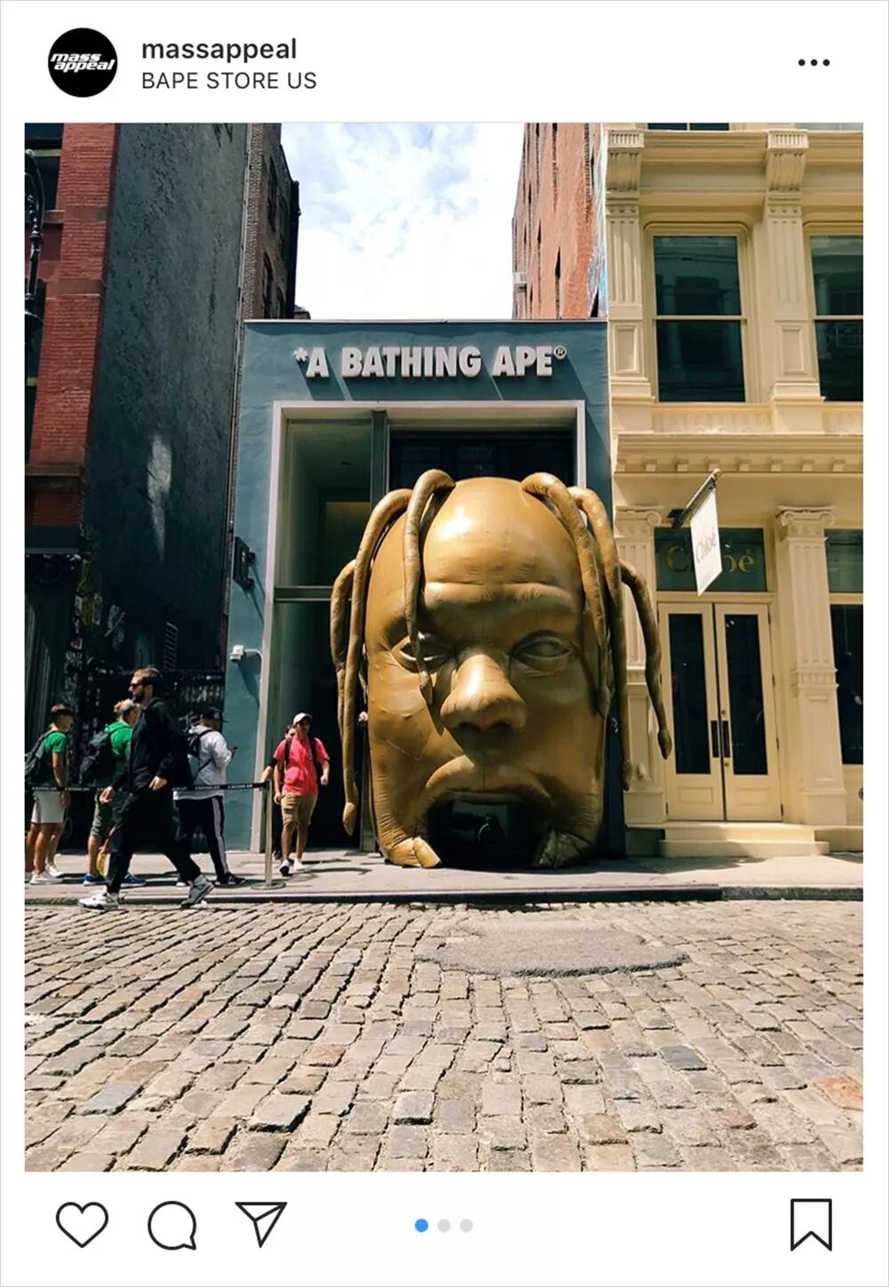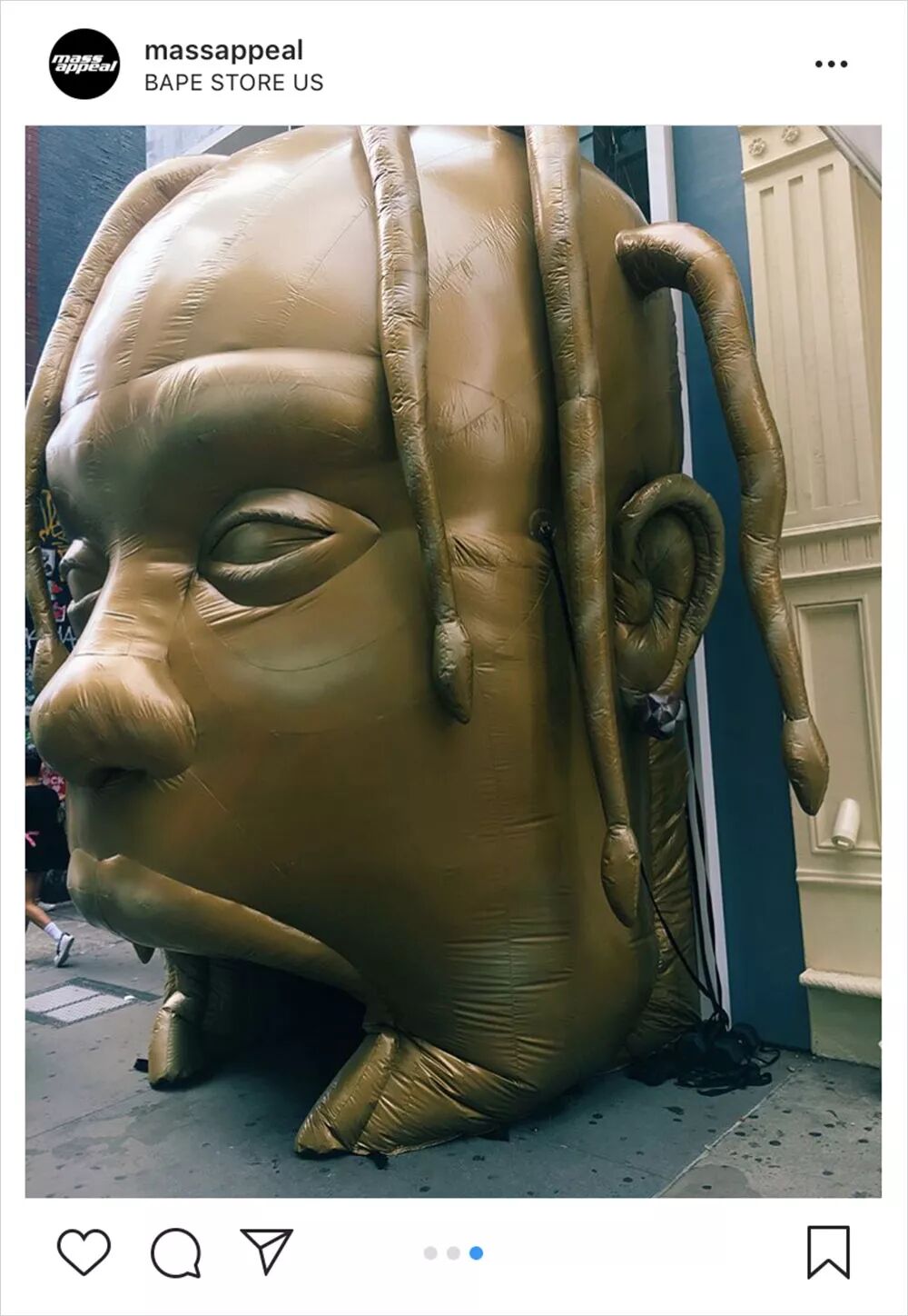 如果你正好身处美国,应该不难看到 Travis Scott 为了给新专辑做预热而在多处地方安置的巨型气球头像吧,此番现象在网络上也引起了热潮。而一向和 Travis Scott 关系不错的 BAPE®︎ 也于日前表示了支持,可以看到巨大的头像放置在店铺门前直接是将门口挡住了,仅剩一个小入口,不过想必这 Travis 头像也会为店铺招揽不少客人吧。